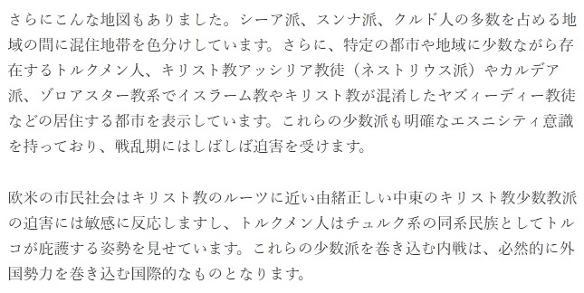 欧米の市民社会はキリスト教のルーツに近い由緒正しい中東のキリスト教少数教派の迫害には敏感に反応しますし、トルクメン人はチュルク系の同系民族としてトルコが庇護する姿勢を見せています。これらの少数派を巻き込む内戦は、必然的に外国勢力を巻き込む国際的なものとなります。