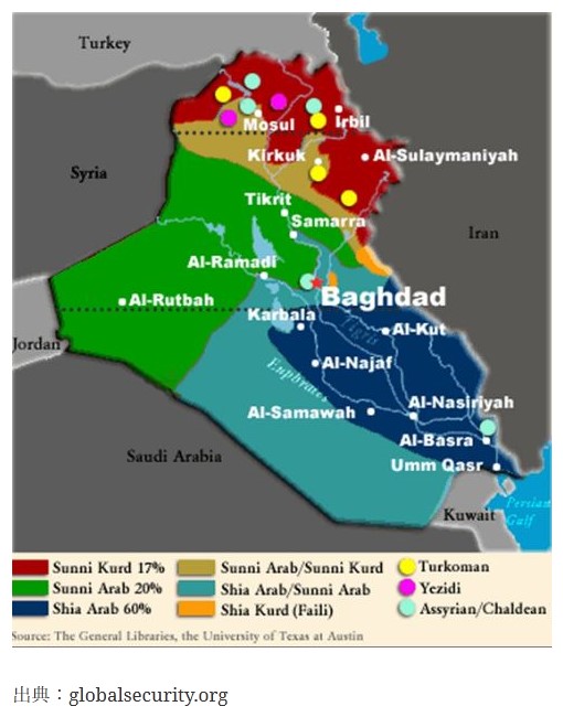 さらにこんな地図もありました。シーア派、スンナ派、クルド人の多数を占める地域の間に混住地帯を色分けしています。さらに、特定の都市や地域に少数ながら存在するトルクメン人、キリスト教アッシリア教徒(ネストリウス派)やカルデア派、ゾロアスター教系でイスラーム教やキリスト教が混淆したヤズィーディー教徒などの居住する都市を表示しています。これらの少数派も明確なエスニシティ意識を持っており、戦乱期にはしばしば迫害を受けます。