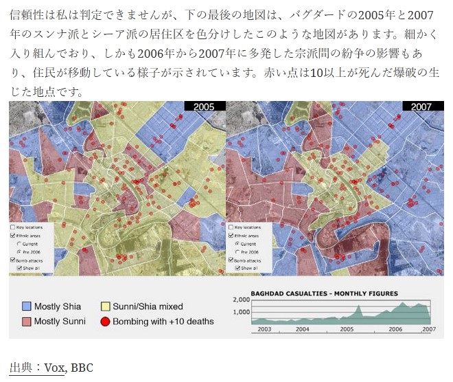 信頼性は私は判定できませんが、下の最後の地図は、バグダードの2005年と2007年のスンナ派とシーア派の居住区を色分けしたこのような地図があります。細かく入り組んでおり、しかも2006年から2007年に多発した宗派間の紛争の影響もあり、住民が移動している様子が示されています。赤い点は10以上が死んだ爆破の生じた地点です。