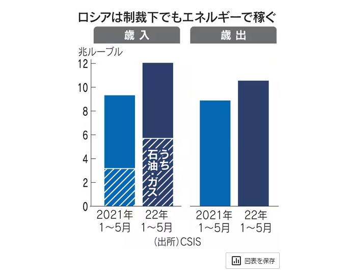 米戦略国際問題研究所(CSIS)によると、同国歳入の半分を占める石油・ガス関連は22年1~5月に5兆7000億ルーブル(約14兆円)と前年同期比8割増えた。ロシア政府は1日約5億ドルをエネルギーで稼ぎ、約3億ドルを軍事費にあてている計算になる。