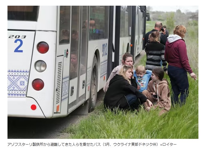 アゾフスターリ製鉄所から避難してきた人らを乗せたバス(5月、ウクライナ東部ドネツク州)=ロイター