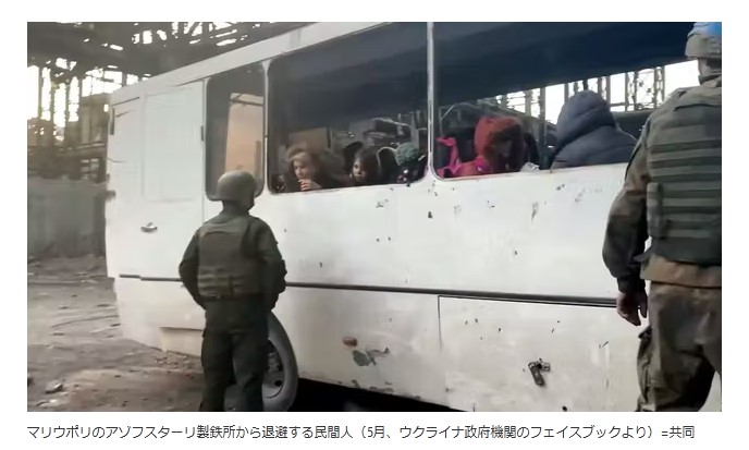 マリウポリのアゾフスターリ製鉄所から退避する民間人(5月、ウクライナ政府機関のフェイスブックより)=共同