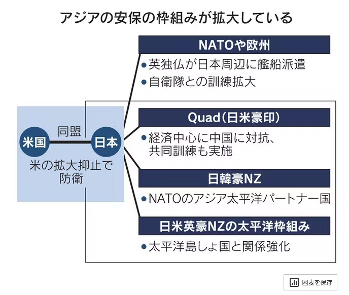 慶大の鶴岡路人准教授は「中国の動きがアジア以外でも広がっており、米国の相対的な地位が低下しつつある」と指摘する。「日米同盟だけでは対処しきれない問題も増え、日本は他の国との枠組みで補う必要が出てきた」と語った。