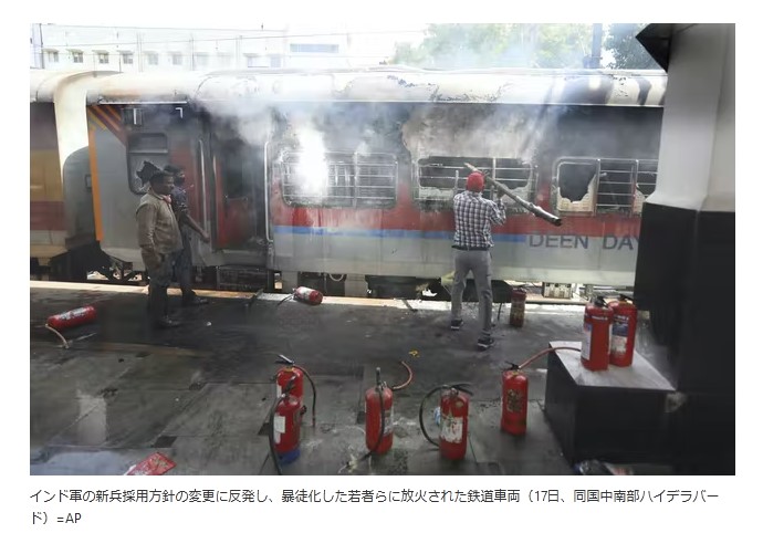 インド軍の新兵採用方針の変更に反発し、暴徒化した若者らに放火された鉄道車両(17日、同国中南部ハイデラバード)=AP新型コロナ対策のロックダウン(都市封鎖)などで就職の機会が制限されるインドの若者にとって、軍は安定した就職先の一つだった。だが、改革が実行されれば、軍で働ける期間は期待より短くなり、年金も受け取れない可能性がある。入隊を目指していた若者の多くが各地で抗議活動に乗り出し、一部は暴徒化した。電車を燃やし、幹線道路を封鎖し、数百人が治安当局に拘束された。少なくとも1人が死亡した。