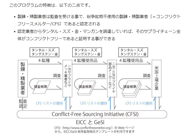 そこで、米国電子業界団体であるElectronic Industry Citizenship Coalition(EICC)と欧州の情報通信関連の業界団体であるGlobal e-Sustainability Initiativeが共同でCFS(コンフリクトフリースメルター)プログラムという、紛争鉱物調査への対応プログラムを開発しました。