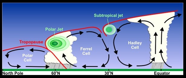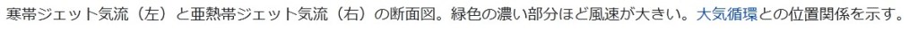 寒帯ジェット気流(左)と亜熱帯ジェット気流(右)の断面図。緑色の濃い部分ほど風速が大きい。大気循環との位置関係を示す。