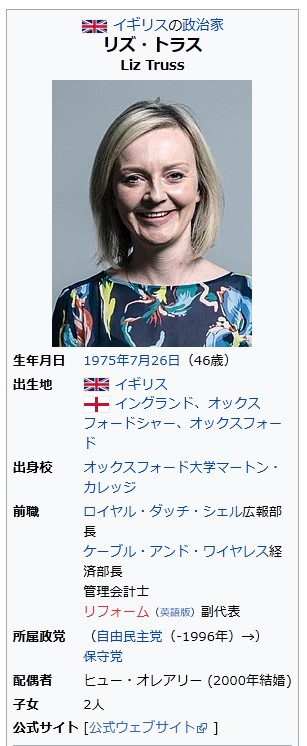 リズ・トラスhttps://ja.wikipedia.org/wiki/%E3%83%AA%E3%82%BA%E3%83%BB%E3%83%88%E3%83%A9%E3%82%B9