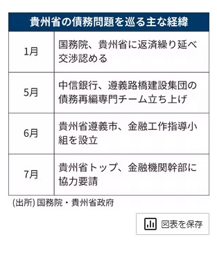 「返済繰り延べ、金利引き下げ、借り換えなどによって債務リスクを解消しなければならない」。7日、貴州省トップの諶貽琴(チェン・イーチン)省共産党委員会書記は金融機関幹部を招いた会議でインフラ投資会社に対する金融支援を要請した。