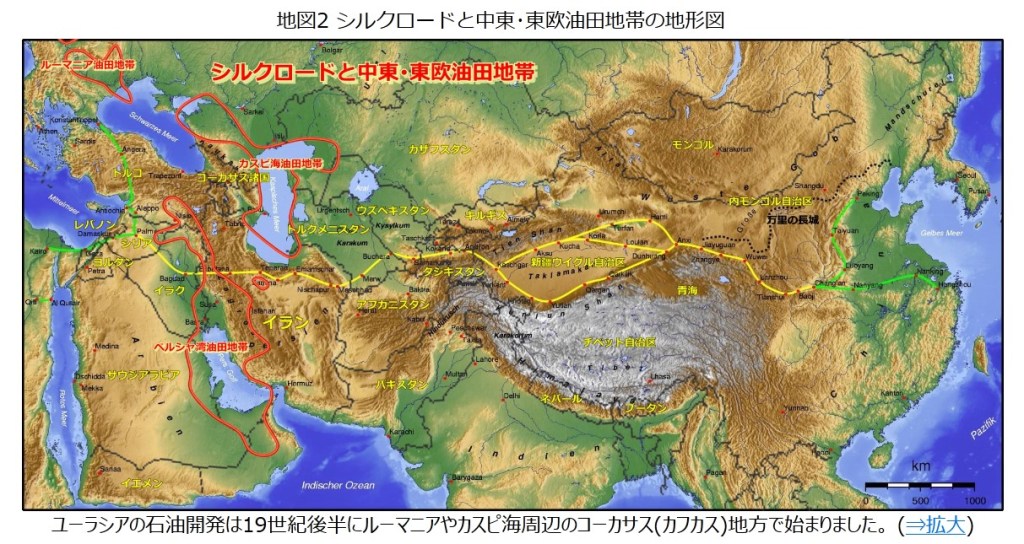 地図2 シルクロードと中東・東欧油田地帯の地形図