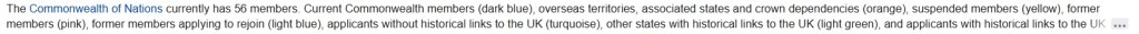 独立した地域にはイギリス連邦に参加する国と参加しない国があり、前者はさらに、イギリスの王を君主とする英連邦王国 (Commonwealth realm) と、それ以外の国に分かれる。