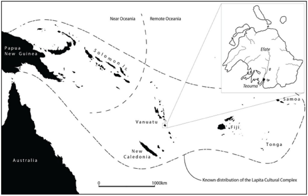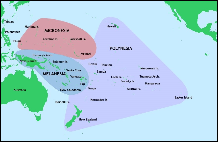 そこからオーストロネシア語系の言語を持つモンゴロイド系のラピタ人と呼ばれる人々は、パプアニューギニアのビスマーク諸島から東南方向に島伝いで移動しフィジーにたどり着いた。そこから南西方向(ヴァヌアツとニューカレドニア)と南東方向(トンガとサモア)の二方向に分かれて遠くまで移動を続けた。こうしてトンガやサモアにたどりついたラピタ人は、そこで1000年ほど留まり今のポリネシア文化の祖形を作り上げた。そして、ポリネシア人へと変容した。およそ2000年前に移動を再開し、1600年前ごろにはハワイ諸島やイースター島まで到達していた。さらに、彼らポリネシア人は、800年前にはニュージーランドにたどり着いている[10]。これらの島々は船によって緊密な連絡を相互に保っており、950年ごろに成立したトンガ大首長国は北のサモアや西のフィジーまでを支配下におさめた一大帝国を1500年ごろまで維持していた。 ヨーロッパとの接触