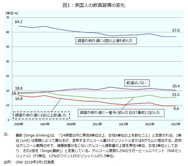 注: 暴飲 (binge drinking)は、「24時間以内に男性8単位以上、女性6単位以上を飲むこと」と定義される。1単位 (unit) は酒類によって異なるが、含有するアルコール量10ミリリットルまたは8グラムに相当する。政府はアルコール戦略の中で、健康被害が生じないアルコール摂取量の上限を男性4単位、女性3単位としており、その2倍を「binge(暴飲)」と定義している。アルコール度数5.2%のラガービール1パイント(568ミリリットル)が3単位、12%のワイン125ミリリットルが1.5単位。 出所: ONS 2018年5月1日発表