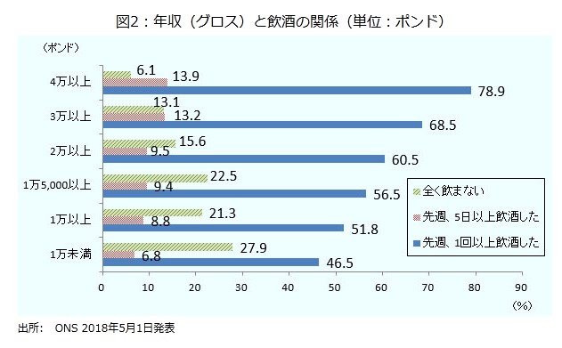 図2:年収(グロス)と飲酒の関係(単位:ポンド) 年収は順に1万ポンド未満、1万ポンド以上1万5,000ポンド未満、1万5,000ポンド以上2万ポンド未満、2万ポンド以上3万ポンド未満、3万ポンド以上4万ポンド未満、4万ポンド以上の6段階。(以下回答は、年収枠順) 先週1回以上飲酒した人の比率(46.5%,51.8%,56.5%,60.5 %, 68.5%,78.9%) 先週5日以上飲酒した(6.8 %,8.8%,9.4 %,9.5%,13.2%,13.9%) 飲酒はしない(27.9%,21.3%,22.5%,15.6%,13.1%,6.1%)
