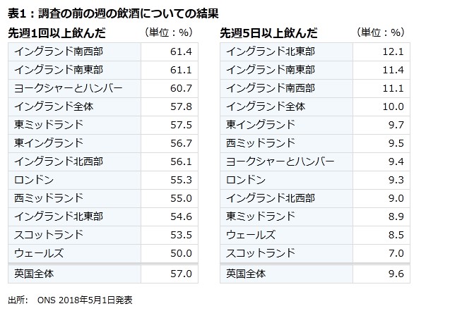 先週1回以上飲んだ (単位:%) イングランド南西部 61.4 イングランド南東部 61.1 ヨークシャーとハンバー 60.7 イングランド全体 57.8 東ミッドランド 57.5 東イングランド 56.7 イングランド北西部 56.1 ロンドン 55.3 西ミッドランド 55.0 イングランド北東部 54.6 スコットランド 53.5 ウェールズ 50.0 英国全体 57.0 先週5日以上飲んだ (単位:%) イングランド北東部 12.1 イングランド南東部 11.4 イングランド南西部 11.1 イングランド全体 10.0 東イングランド 9.7 西ミッドランド 9.5 ヨークシャーとハンバー 9.4 ロンドン 9.3 イングランド北西部 9.0 東ミッドランド 8.9 ウェールズ 8.5 スコットランド 7.0 英国全体 9.6