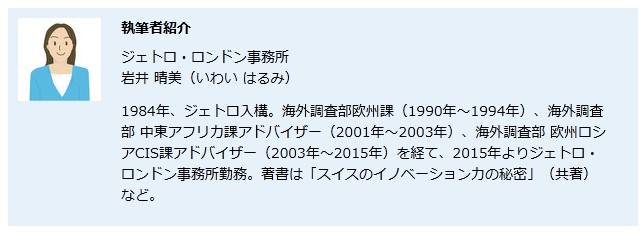 執筆者紹介 ジェトロ・ロンドン事務所 岩井 晴美(いわい はるみ) 1984年、ジェトロ入構。海外調査部欧州課(1990年~1994年)、海外調査部 中東アフリカ課アドバイザー(2001年~2003年)、海外調査部 欧州ロシアCIS課アドバイザー(2003年~2015年)を経て、2015年よりジェトロ・ロンドン事務所勤務。著書は「スイスのイノベーション力の秘密」(共著)など。 』