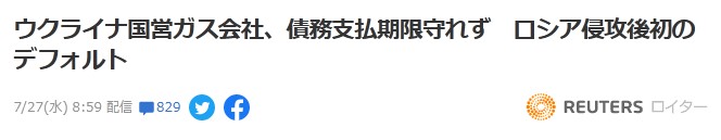 『[ロンドン/キーウ(キエフ) 26日 ロイター] – ウクライナ国営ガス会社ナフトガスは、国際市場で発行した債券の支払いを26日の期限までに履行できないと発表した。ウクライナ政府系企業が債務不履行(デフォルト)に陥るのはロシアによる侵攻開始以降で初めて。