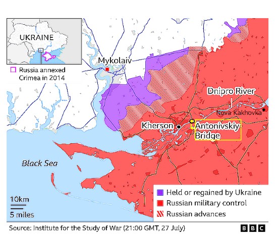 さらにウクライナ軍が現在、集中攻撃をしているのが南部ヘルソン州だ。ヘルソン州は侵攻開始直後、南にあるクリミアから北上したロシア軍地上部隊によって制圧されていた。2022年9月以降とも言われる本格的反攻作戦開始への準備段階として、ウクライナ軍は南部他地域やクリミアからのヘルソンへの補給路を断つため、その間にあるドニエプル川に架かる4つの橋を2022年8月12日までに砲撃などで損傷させた。これにより、ドニエプル川西岸にあるヘルソンは当面、ほぼ補給路を断たれたと言われる。』