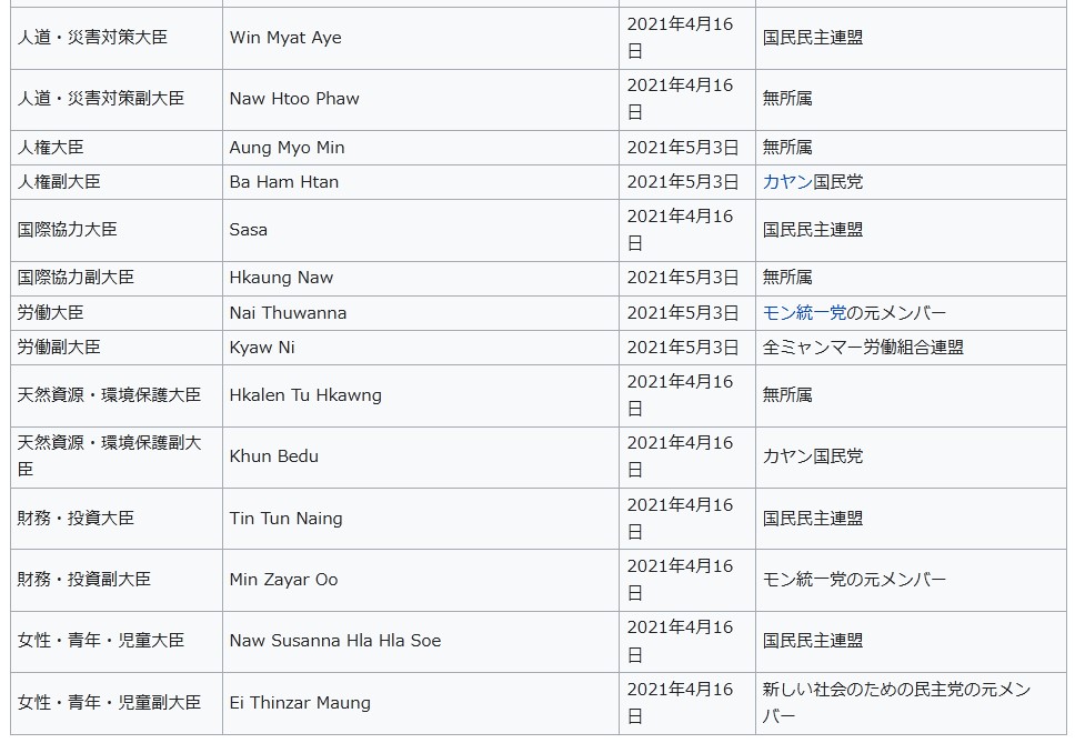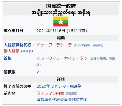 首相 マン・ウィン・カイン・タン(ビルマ語版、英語版)(my:မန်းဝင်းခိုင်သန်း; en:Mahn Win Khaing Than) 2021年4月16日 国民民主連盟