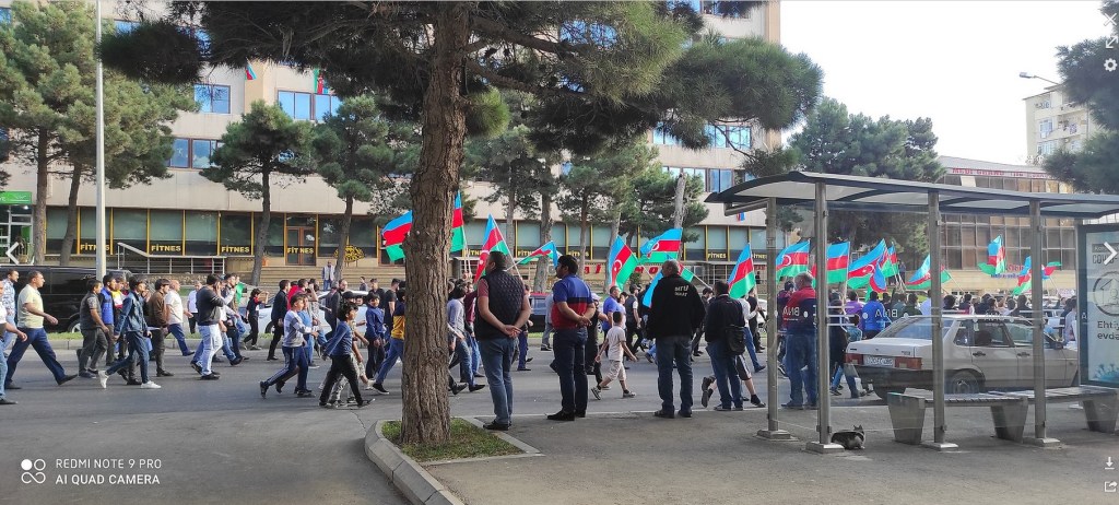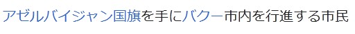 アゼルバイジャン国旗を手にバクー市内を行進する市民