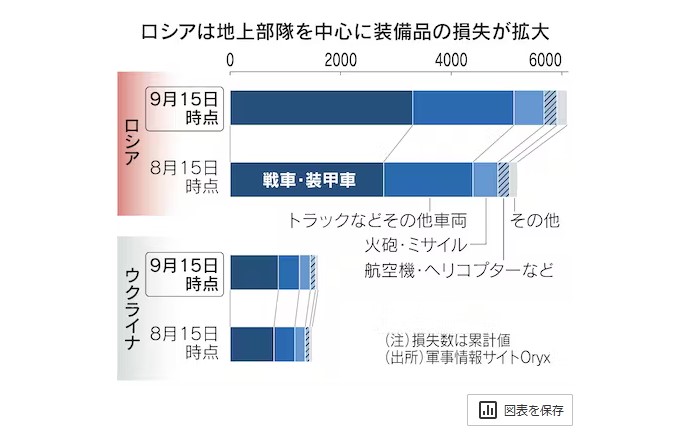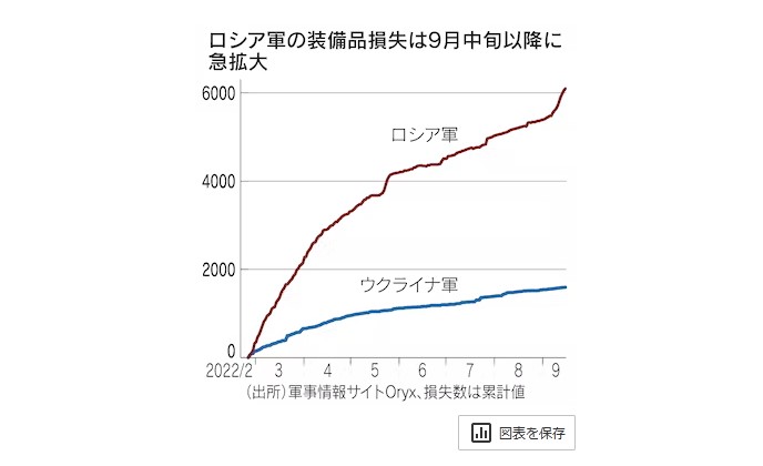 『ウクライナ軍の東部や南部の反攻で、ロシア軍の損害が拡大している。軍事サイトの分析によると、侵攻開始以降の火砲などの兵器の累計損失数はこの1カ月で17%増えた。欧米からの武器供与を受けるウクライナと対照的に、補充が難航している可能性がある。
