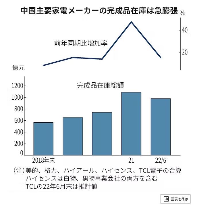 在庫のダブつきは小売り側も同じだ。家電量販2強の国美零售では、22年1~6月の在庫回転日数が約81日と3年前よりも50%拡大。蘇寧易購集団も21年時点で約50日と、20年から25%増えた。