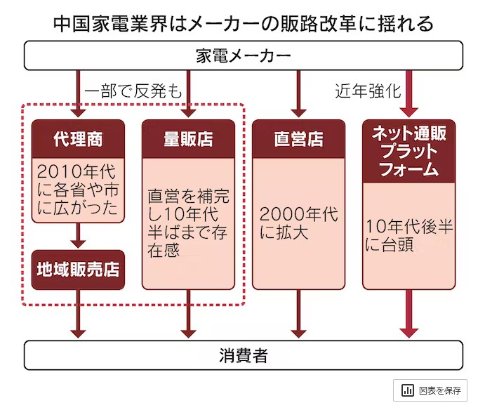中国の家電業界は、普及期の00年代にメーカー直営を中心とした販路の拡大が進められていた。量販店もその補完的役割を担った。10年代に成長に一服感が出始めると、リスク分散を目的に代理商などを経由するようになった。