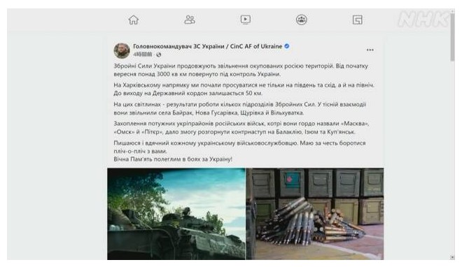 ウクライナ軍のザルジニー総司令官は11日、SNSにメッセージを投稿し「ウクライナ軍は占領された領土を解放し続けている。9月はじめから、3000平方キロメートル以上の領土を解放した」と明らかにしました。