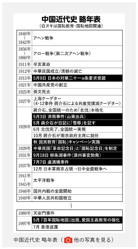 年表をご覧いただこう。「国恥」という言葉が最初にメディアに現れたのは1915年、日本が袁世凱・北京政府に「21カ条要求」を突きつけた時だとされる。袁世凱が要求を受け入れたことに国民が猛反対し、新聞が「国の恥」だと書いた。