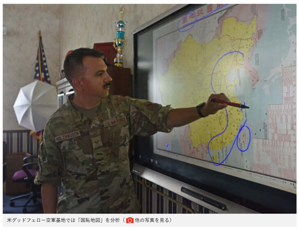国恥地図については、後で詳しく触れるが、「産経新聞」(2021年12月6日付)の報道によれば、テキサス州グッドフェロー空軍基地に所属する教育訓練機関が訓練風景を公開した数枚の写真の中に、偵察・情報担当の教官が「国恥地図」をもとに講義する様子が写っていた。記事では、詳細は不明だがと断わりがあるが、教官が国恥地図を指しながら、台湾や中国大陸の沿岸部を青い蛍光ペンで囲んで、何ごとかを説明している。