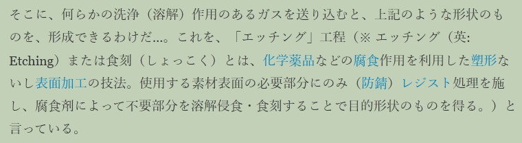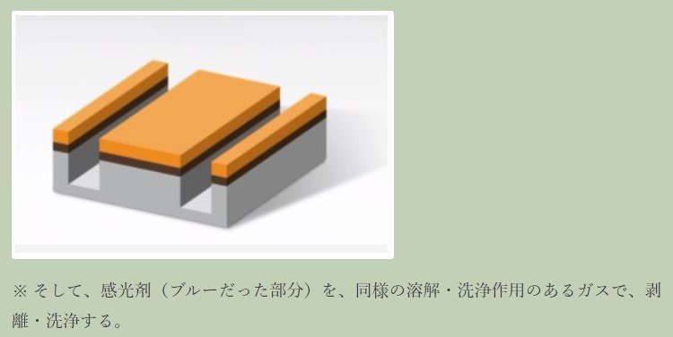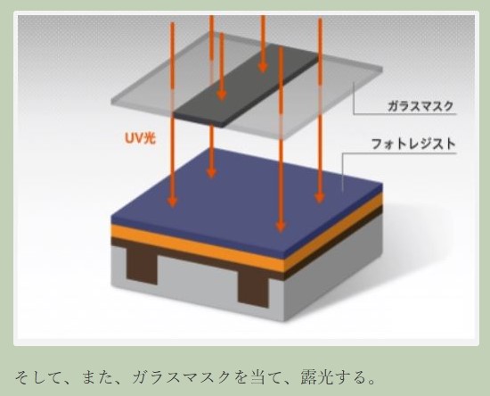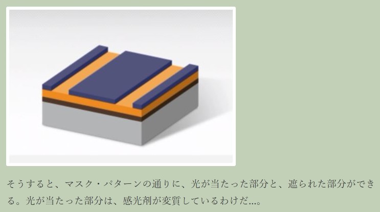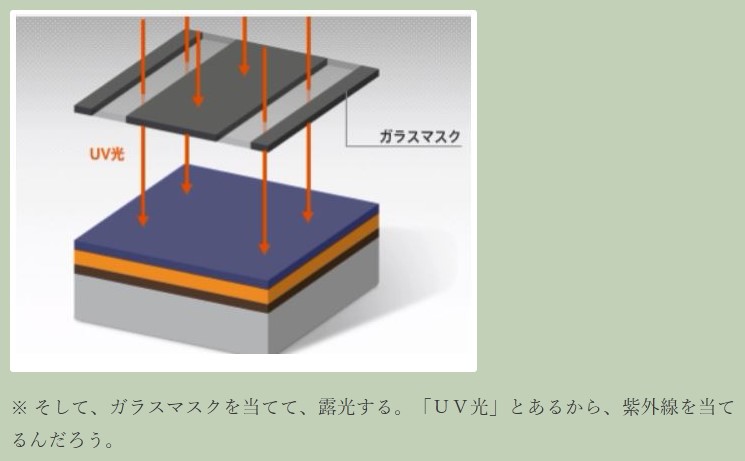 ※ そうすると、フォトレジスト(感光材)が「化学変化」起こして、後の「エッチングガス」なんかで、「洗い流せる」ようになる…。