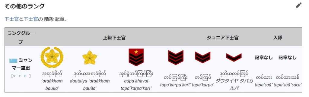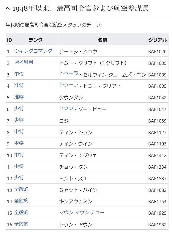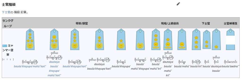 18. Myanmar Air Force SGEN.png 17. Myanmar Air Force VSGEN.png General 15. Myanmar Air Force LG.png 14. Myanmar Air Force MG.png 13. Myanmar Air Force BG.png 12. Myanmar Air Force COL.png 11. Myanmar Air Force LTCOL.png 10. Myanmar Air Force MAJ.png 09. Myanmar Air Force CAPT.png 08. Myanmar Air Force 1LT.png 07. Myanmar Air Force 2LT.png Myanmar Air Force OC.png