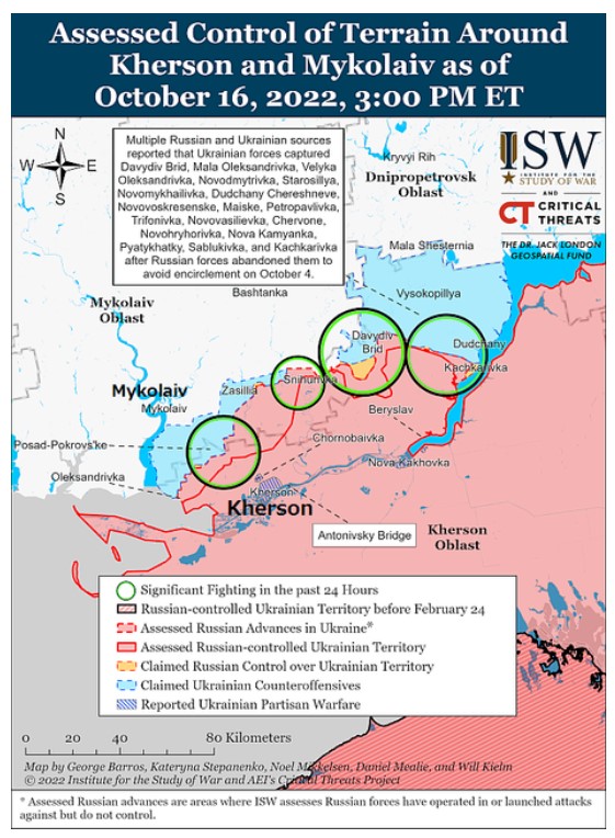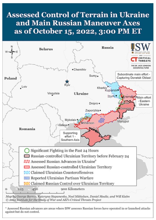 マリウポリMariupolで起きたように、露軍は占領地でのウクライナ人市民の移動を禁じ、攻撃に対し市民を盾に使う可能性がある。右下は、2022年10月17日掲載の戦況図で、赤いマークがロシアが側の地上,ロケット攻撃を示している。