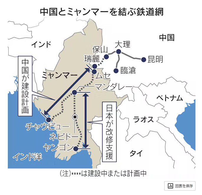 18年、中国中鉄とミャンマー国鉄がムセ・マンダレー間の鉄道建設に向けた事業化調査で合意。36の駅、124の橋、60のトンネルを建設するという内容で総事業費の見積もりは89億ドル(1兆3千億円)とされる。マンダレー・チャウピュー間でも21年1月に事業化調査の覚書を交わした。