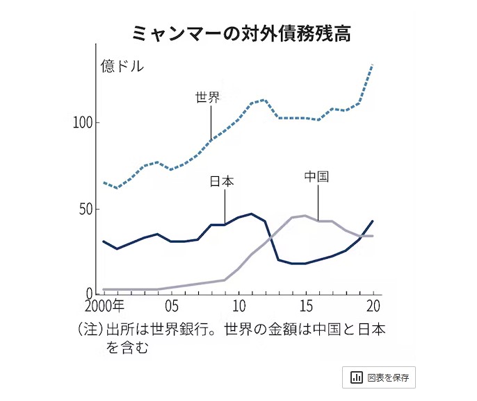 債務の面では、実はミャンマーの対外債務や中国への依存は比較的小さい。世界銀行によるとミャンマーの対外債務は20年時点で国民総所得(GNI)比17%。ラオス(95%)やカンボジア(71%)に比べると低い。相手国別の債務残高で中国が占める比率も25%と、日本を下回る水準だ。