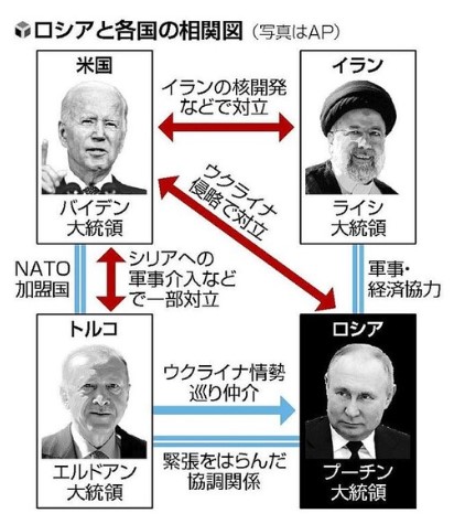 侵略者プーチン氏aggressor Putinは、イラン、トルコと経済協力を拡大し、ウクライナ侵略に伴う米欧による制裁の打撃を緩和する狙いがあると評論されている。英文記事