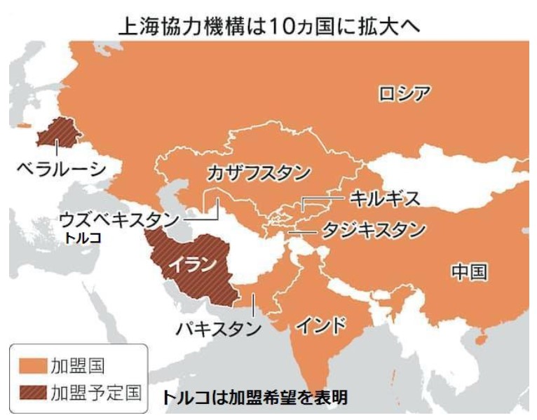 現在、中ロのほか、カザフスタン、ウズベキスタン、キルギス、タジキスタンの中央アジア4カ国とインド、パキスタンが加盟し、イランが正式加盟の手続きに入り、ベラルーシを含め10カ国体制に広がることが固まった。