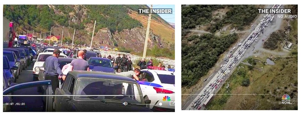 ジョージアGeorgeと国境を接するロシアの北オセチアNorth Osettia地域では、国境を越えようとする車が15キロほど列をなし、深刻な交通渋滞が起きている。参照記事 記録映像;ロシアからジョージア国境へ向かう膨大な数の車両の列