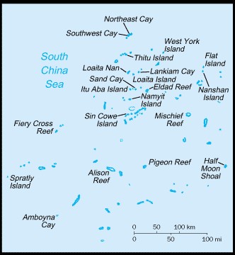 『南沙諸島(なんさしょとう)、スプラトリー諸島(英語: Spratly Islands)は、日本語では新南群島(しんなんぐんとう)といい、南シナ海南部に位置する諸島である。岩礁・砂州を含む無数の海洋地形(maritime features)からなり、これらの多くは環礁の一部を形成している。
