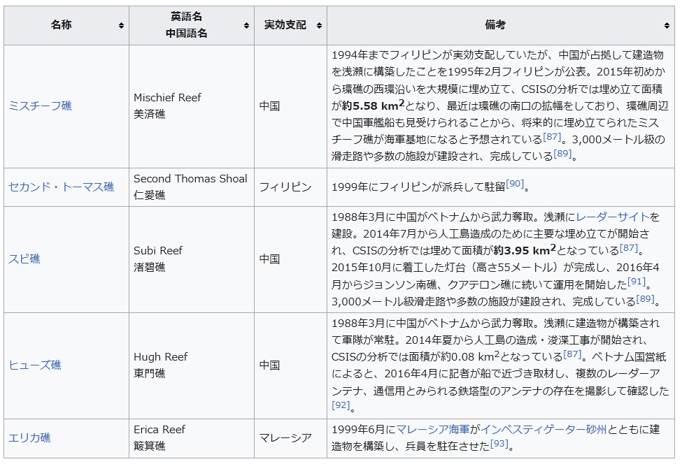 名称 英語名 中国語名 実効支配 備考 ミスチーフ礁 Mischief Reef 美済礁 中国 1994年までフィリピンが実効支配していたが、中国が占拠して建造物を浅瀬に構築したことを1995年2月フィリピンが公表。2015年初めから環礁の西環沿いを大規模に埋め立て、CSISの分析では埋め立て面積が約5.58 km2となり、最近は環礁の南口の拡幅をしており、環礁周辺で中国軍艦船も見受けられることから、将来的に埋め立てられたミスチーフ礁が海軍基地になると予想されている[87]。3,000メートル級の滑走路や多数の施設が建設され、完成している[89]。 セカンド・トーマス礁 Second Thomas Shoal 仁愛礁 フィリピン 1999年にフィリピンが派兵して駐留[90]。 スビ礁 Subi Reef 渚碧礁 中国 1988年3月に中国がベトナムから武力奪取。浅瀬にレーダーサイトを建設。2014年7月から人工島造成のために主要な埋め立てが開始され、CSISの分析では埋めて面積が約3.95 km2となっている[87]。2015年10月に着工した灯台(高さ55メートル)が完成し、2016年4月からジョンソン南礁、クアテロン礁に続いて運用を開始した[91]。3,000メートル級滑走路や多数の施設が建設され、完成している[89]。 ヒューズ礁 Hugh Reef 東門礁 中国 1988年3月に中国がベトナムから武力奪取。浅瀬に建造物が構築されて軍隊が常駐。2014年夏から人工島の造成・浚渫工事が開始され、CSISの分析では面積が約0.08 km2となっている[87]。ベトナム国営紙によると、2016年4月に記者が船で近づき取材し、複数のレーダーアンテナ、通信用とみられる鉄塔型のアンテナの存在を撮影して確認した[92]。 エリカ礁 Erica Reef 簸箕礁 マレーシア 1999年6月にマレーシア海軍がインベスティゲーター砂州とともに建造物を構築し、兵員を駐在させた[93]。 地理的状況