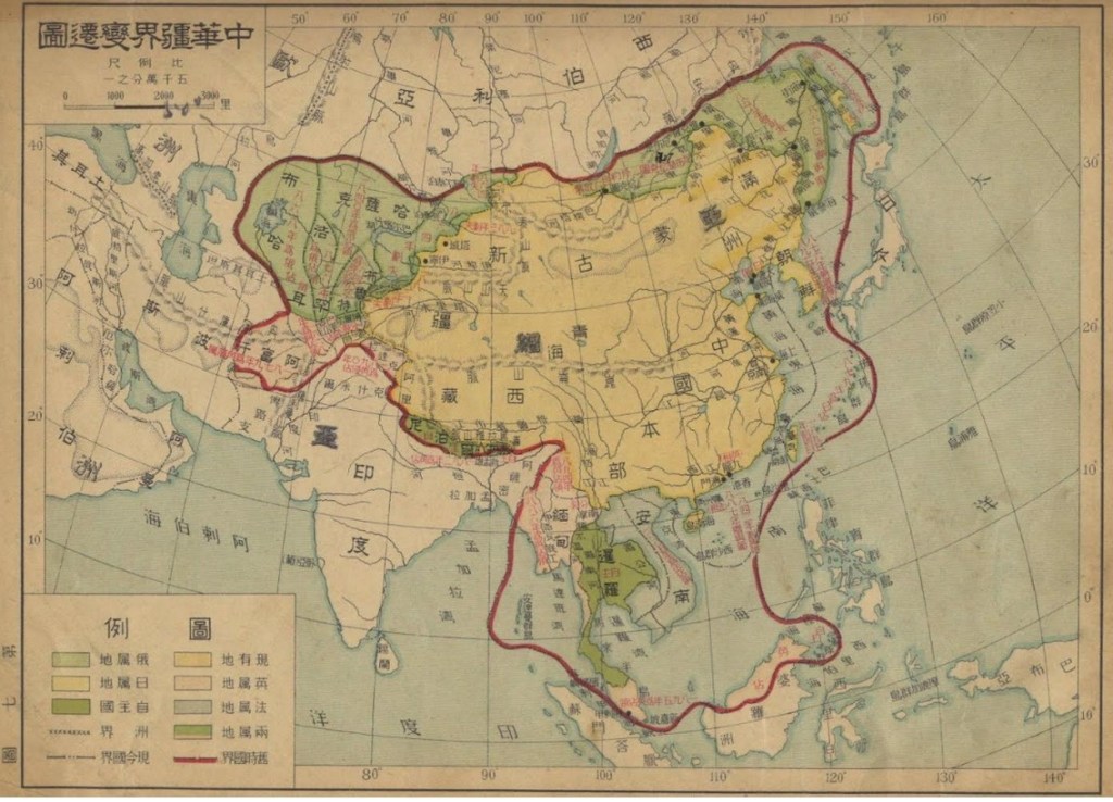 明・清の官修地誌では、領土の最南端は海南島とされており、南沙諸島は清の領土線の外であった。官修地誌以外の民間著作でも、清の中晩期の『南洋蠡測』(顔斯綜の著)中に「萬里石塘」の記載があり、「此の塘を以て華夷中外の界を分かつ」と記述されている。境界線の位置は海南島の南の西沙諸島付近であった。また清の乾隆年間の『吧遊紀略』(陳洪照の著)では、海南島付近と推定される「七州洋」を「中外之界」としている[15]。 ベトナムを植民地支配していたフランスによる領有