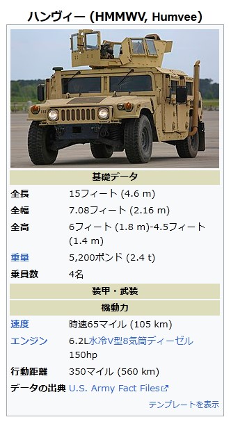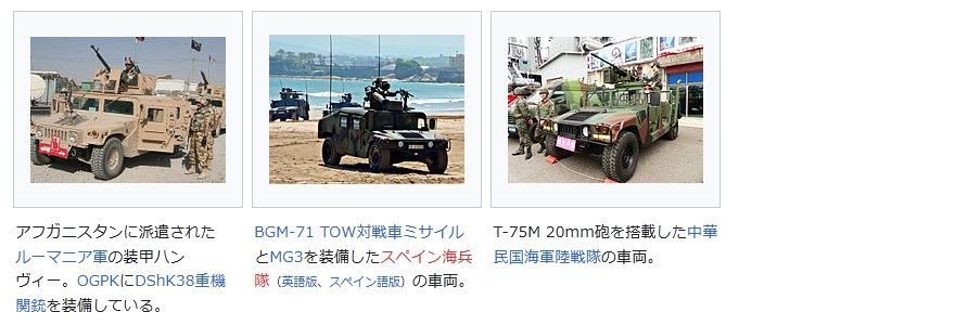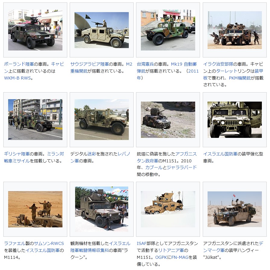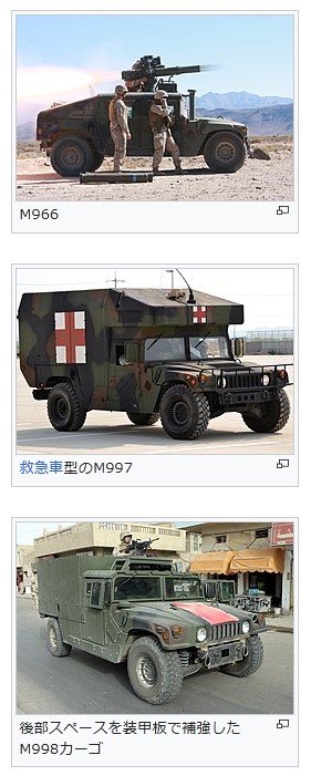 ハンヴィーhttps://ja.wikipedia.org/wiki/%E3%83%8F%E3%83%B3%E3%83%B4%E3%82%A3%E3%83%BC#%E4%B8%BB%E8%A6%81%E5%9E%8B