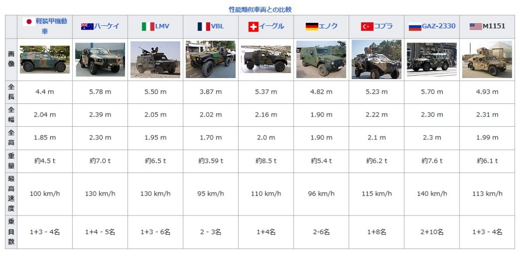 性能類似車両との比較 日本の旗軽装甲機動車 オーストラリアの旗ハーケイ イタリアの旗LMV フランスの旗VBL スイスの旗イーグル ドイツの旗エノク トルコの旗コブラ ロシアの旗GAZ-2330 アメリカ合衆国の旗M1151 画像 Komatsu LAV – 1.jpg Hawkei DSC02320.JPG LinceVM.jpg Panhard VBL (Vèhicule Blindé Legér), French army licence registration ‘6924 0051’ pic1.JPG Mowag Eagle IV.jpg Light Armoured Patrol Vehicle ENOK.jpg Paradbaku98.jpg GAZ 2975 Tigr.JPG M1151.jpg 全長 4.4 m 5.78 m 5.50 m 3.87 m 5.37 m 4.82 m 5.23 m 5.70 m 4.93 m 全幅 2.04 m 2.39 m 2.05 m 2.02 m 2.16 m 1.90 m 2.22 m 2.30 m 2.31 m 全高 1.85 m 2.30 m 1.95 m 1.70 m 2.0 m 1.90 m 2.1 m 2.3 m 1.99 m 重量 約4.5 t 約7.0 t 約6.5 t 約3.59 t 約8.5 t 約5.4 t 約6.2 t 約7.6 t 約6.1 t 最高速度 100 km/h 130 km/h 130 km/h 95 km/h 110 km/h 96 km/h 115 km/h 140 km/h 113 km/h 乗員数 1+3 – 4名 1+4 – 5名 1+3 – 6名 2 – 3名 1+4名 2-6名 1+8名 2+10名 1+3 – 4名 各型 主要型