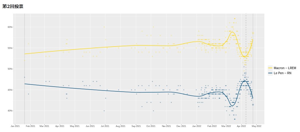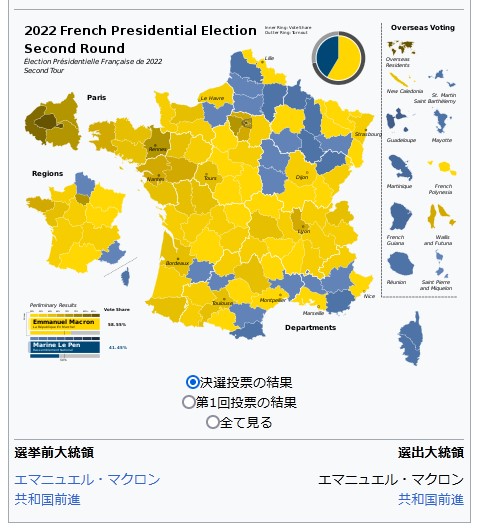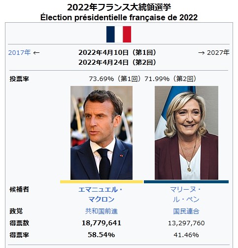 2022年5月16日に任期満了するエマニュエル・マクロン大統領の後継大統領を選ぶ選挙である。4月10日の第1回目投票で過半数を得た候補者がいなかったため、4月24日の決選投票で当選者が決定された。