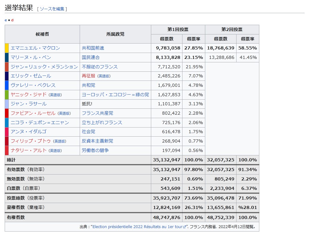 出典:“Election présidentielle 2022 Résultats au 1er tour”. フランス内務省. 2022年4月12日閲覧。』