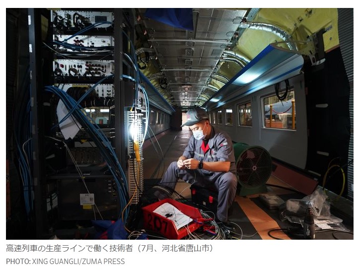 同社は今世紀に入ってからの15年間、アジア全域のインフラプロジェクトで中心的役割を果たし、北京や上海などの大都市の地下でも活躍してきた。同社の掘削機は、何階層にも分かれた工場のようなもので、地中の掘削を進めながら配線やコンクリート壁を敷設していく。 高速列車の生産ラインで働く技術者(7月、河北省唐山市) Photo: Xing Guangli/Zuma Press