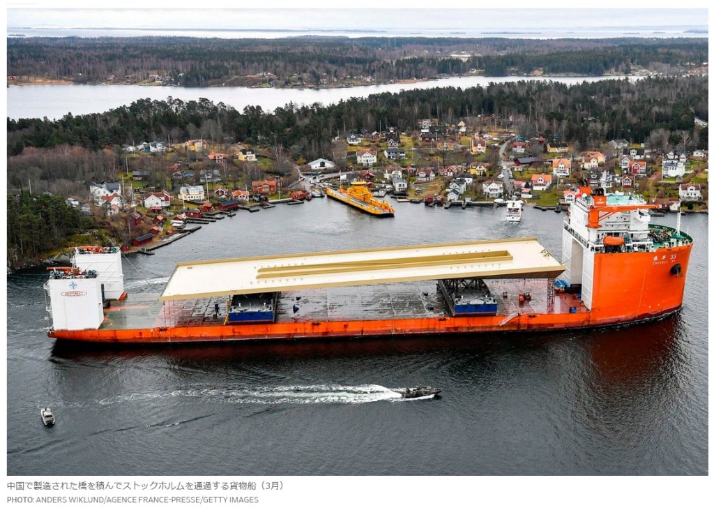 中国政府が新型コロナウイルスの拡散を制御できていることや、経済を支える同国の政策を背景に、同国の輸出業者は、他国が依然としてパンデミックによって身動きが取れない状態の中、世界の輸出におけるシェアを拡大しつつある。 中国で製造された橋を積んでストックホルムを通過する貨物船(3月) Photo: anders wiklund/Agence France-Presse/Getty Images