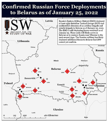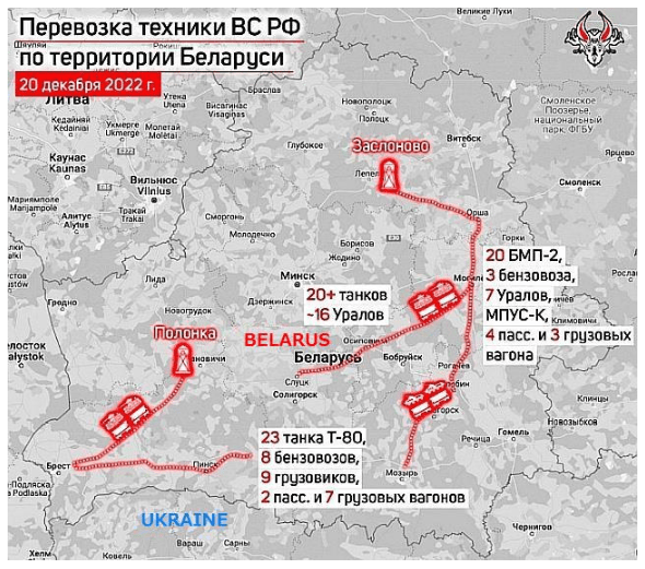 右上右の、以前のベラルーシBelarus内のロシア軍基地と、12月20日公表された上左図で20輌の露軍戦車T-80や20輌の歩兵戦闘車BMP-2等の鉄路での移動先を見れば、既存の露軍基地へ攻撃車輛を増強した事が分かる。