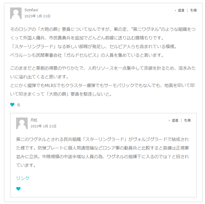 ドイツのSpiegel誌は20日「連邦情報局が安全保障関係の議員に対する極秘会議で『バフムート方面の戦いでウクライナ軍は毎日3桁台の兵士を失っている』と報告、ここを失えばドネツク州の奥深くに進めるため重大な結果をもたらすと警告している」と報じており、連邦情報局は「バフムート方面で見せるロシア軍の戦術は兵士を大砲の餌にすることで、兵士の膨大な損失はロシア軍の作戦戦術において特に問題視されていない」と付け加えている。