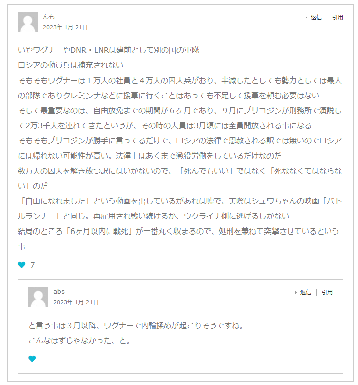 バフムート戦線で戦闘に従事しているチェコ人義勇兵は16日「もうクリシェイフカは我々のものではない」と、露ワグナーのプリゴジン氏も19日「クリシェイフカは我々の支配下にある」と明かしていたが、ロシア国防省も20日「クリシェイフカを解放した」と発表したためCNNなどの海外メディアもクリシェイフカ陥落を一斉に報じ始めた。