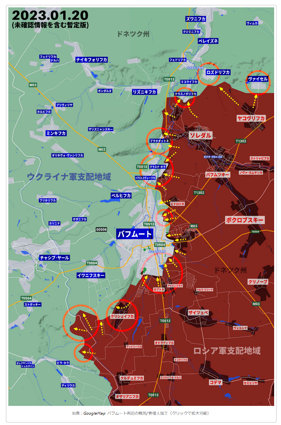 出典:GoogleMap バフムート周辺の戦況/管理人加工(クリックで拡大可能)